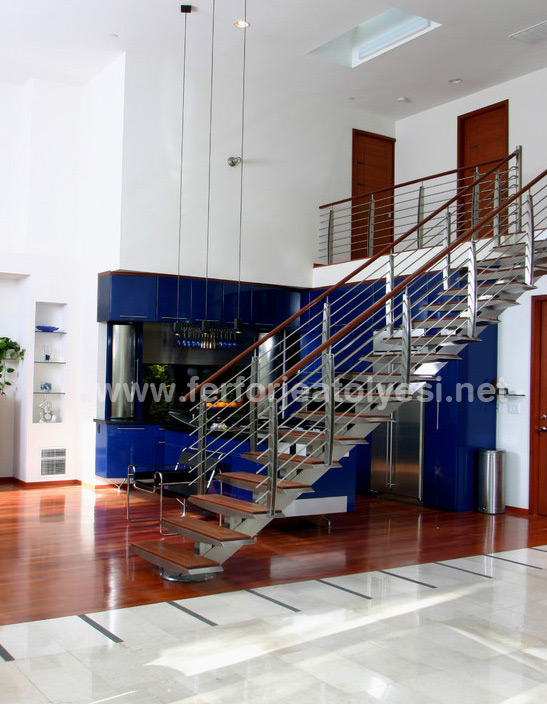 Metal merdiven ahşap merdivenlere nazaran daha fütürist, daha modern görünümdedirler. Ferforje merdivenleri klasik merdiven tasarımları içine katabiliriz elbette. Metal merdivenler günümüzde daha minimalist ve modern bir havada tasarlanmakta. Klasik dekorlu ortamlarda ferforje merdivenler daha uygun iken, daha modern tasarımlı mekanlarda metal merdivenler daha çok tercih edilmektedir. Önemli bir yapı elemanı olan merdivenlerin ortam dekoruna uyum sağlaması önemlidir. Basamakları demir, ahşap, çelik, mika, pleksi gibi malzemelerden yapılabilir. Üstelik neredeyse hiç bakım gerektirmezler. Sadece nemli bez veya paspas ile temizliğini yapmanız yeterli. Uzun yıllar sorunsuzca kullanabileceğiniz metal merdivenler ile tanışmak için bize ulaşın.